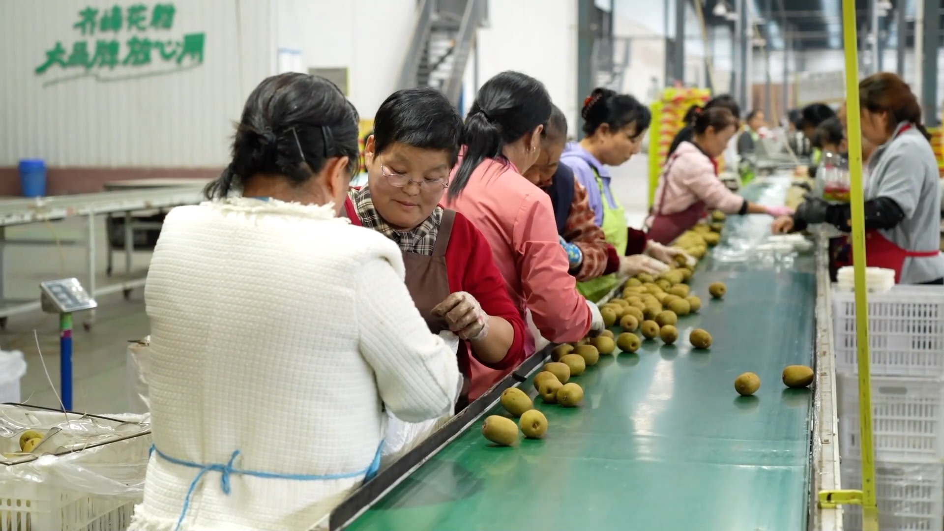 在国家级(眉县)猕猴桃产业园区,工人们在车间正忙着清洗、包装刚采摘下来的猕猴桃,经过检验后的猕猴桃将被运往世界各地。